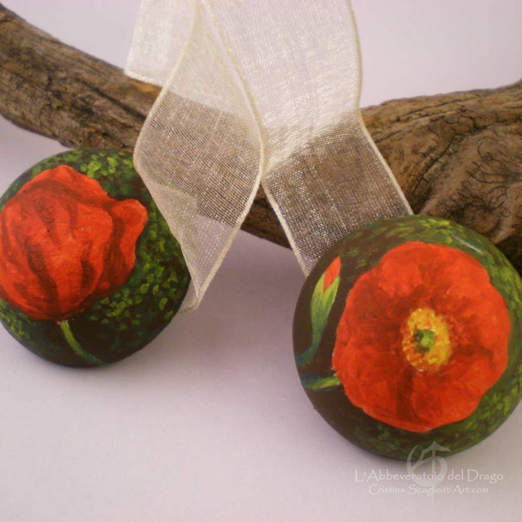 Basi di legno circolari dipinte con colori acrilici e vernice protettiva ad acqua; dotati di magneti e nastro in organza.